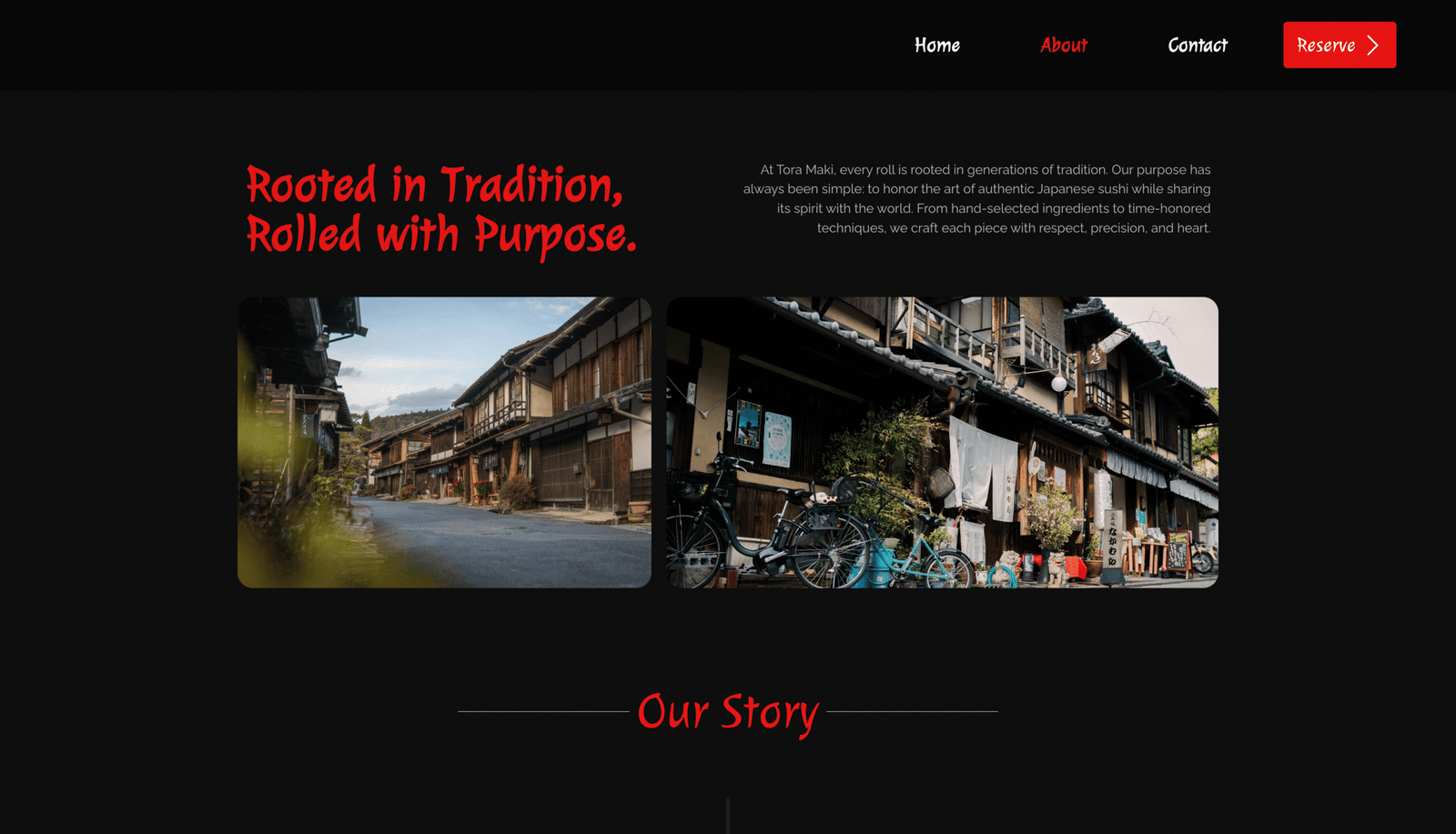Tora Maki is a web design project for a traditional-style sushi restaurant, combining authentic Japanese aesthetics with a clean, modern digital experience. The site captures the elegance and precision of sushi culture while remaining functional and inviting.